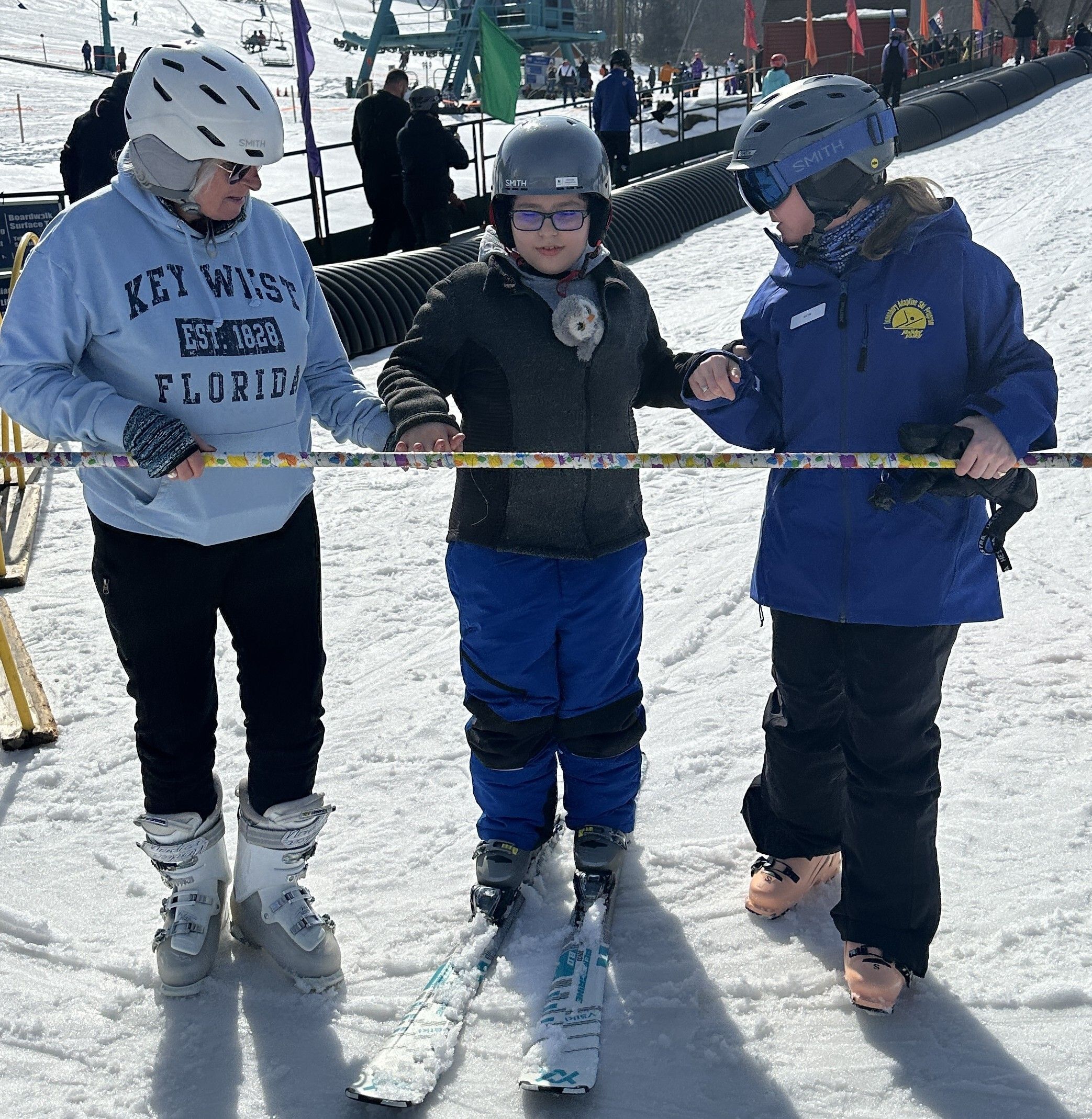 Pictured is 10-year-old Isaac Goro with Lounsbury Adaptive Ski Program volunteer instructors Carole Fierle (left) and Beth Slater (right).