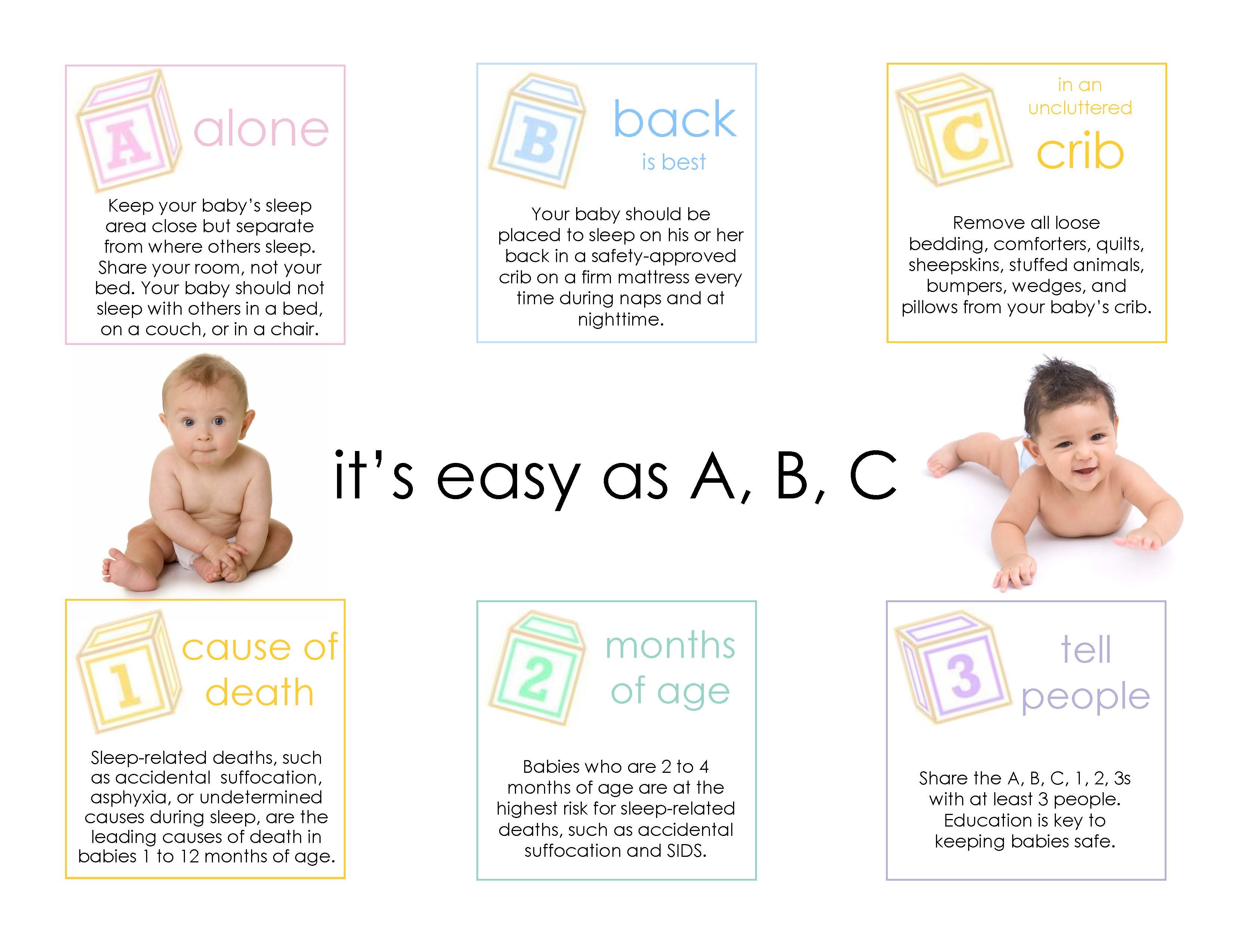According to the National Cribs for Kids® Program, sleep-related deaths, such as accidental suffocation, asphyxia, or undetermined causes during sleep, are the leading cause of death in infants age one month to one year, and in the United States over 3,500 babies will die unexpectedly each year. Research indicates that many and perhaps most of these deaths are related to an unsafe sleeping environment. The safest way for an infant to sleep is Alone, on his or her Back, in a safety-approved Crib.